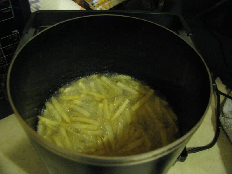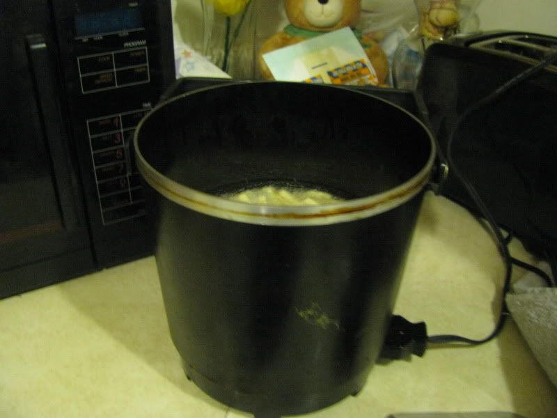 I am guilty of loving yard sales. There is something about them that draws me in like a mosquito to a bug zapper. I love finding bargains! Also! A yard sale is the best place to furnish your first apartment, without having to resort to the dreaded spool table. If you don't know what I'm talking about Google it. I give you a tip it's not the fancy thing in the sidebar. So awhile back we went scavenging though some local yard sales and found the thing that automatically makes your house a home...a frybaby. It was glorious, and a steal at five dollars. We bought it, and I took it home. I am happy to share with you below the christening of our cute little frybaby. We couldn't be prouder of it!