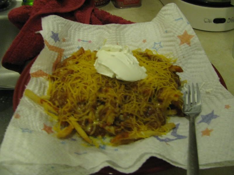 Then in an almost euphoric frenzy the chili and yet another layer of cheese was added. In the final throes of ecstasy the sour cream was added. It looked glorious, it tasted glorious. The next day however...well let's just say I have a new found appreciation for the padded toilet seat. The frybaby has gone on to fry many things, and will soon make it's first batch of beignets. It was completely worth five dollars.
